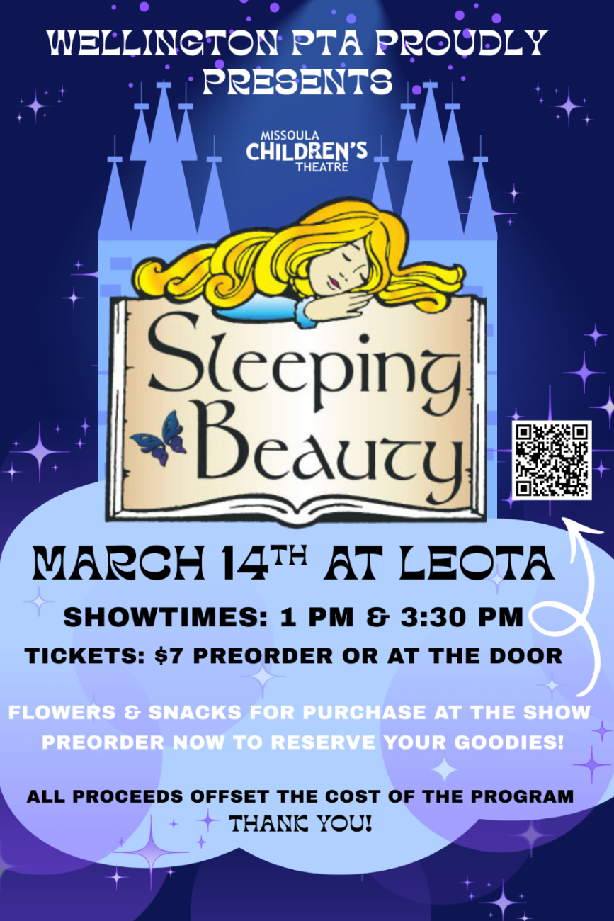 Missoula Children’s Theatre is back March 9 – 13 to bring Sleeping Beauty to Wellington! All students will experience Missoula Children’s Theatre during their regularly scheduled music time. Everyone is invited to the performances on Saturday, March 14 at Leota Middle School. Purchase tickets and concessions here: Sleeping Beauty Tickets and Snacks